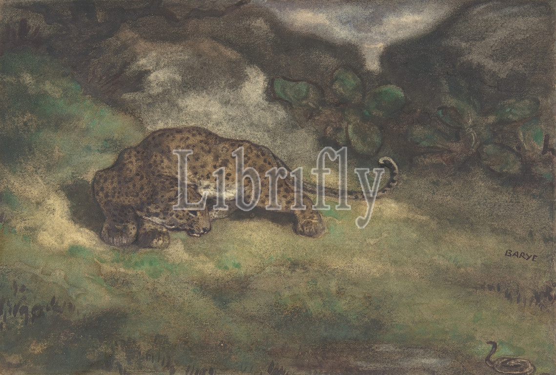 Leopard, Serpent, 1810–75, Watercolor, laid paper, Sheet, 6 5/8 x 9 7/8, 16.8 25.1cm, Drawings, Antoine-Louis Barye, French, Paris, 1796–1875