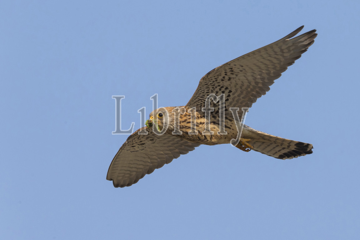 Lesser Kestrel female in flight with prey, Falco naumanni, Italy