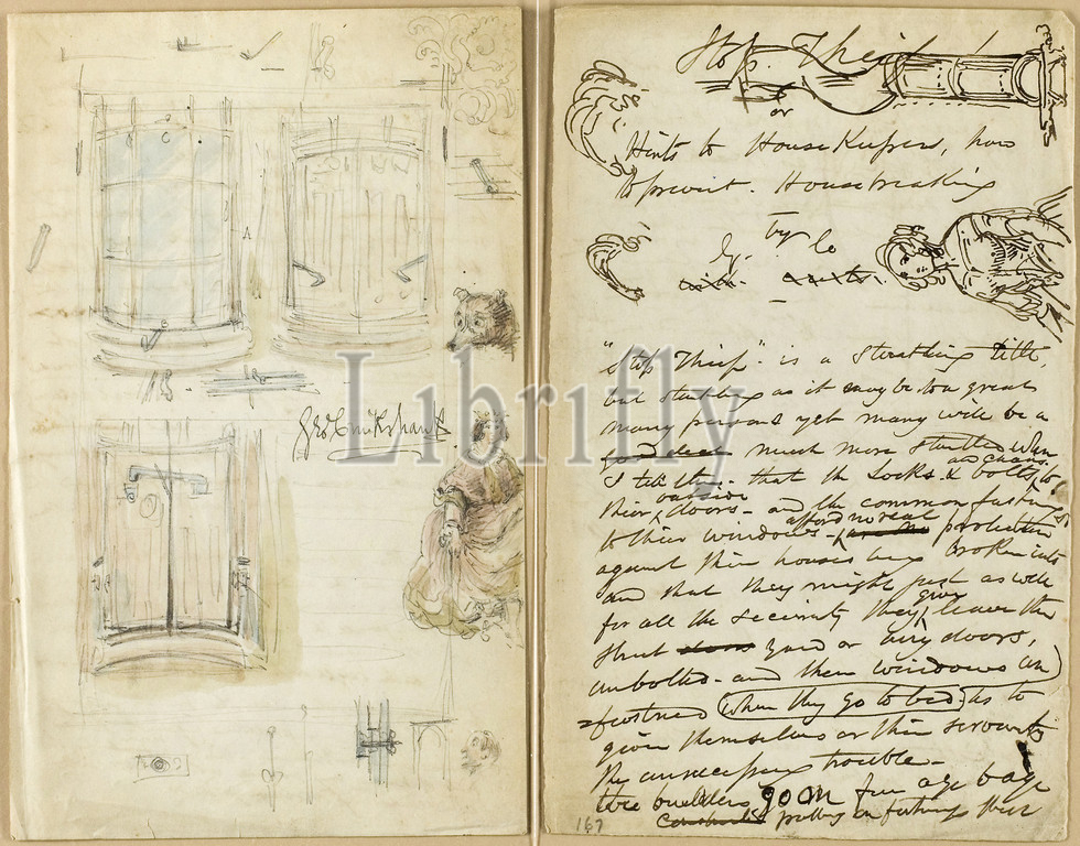 Letter, Stop Thief, 1851, George Cruikshank, English, 1792-1878, England, Signed letter, pen, brown ink, several sketches, entire sheet, sketches, graphite, watercolor, signed, black ink, two sheets, cream wove paper, 228