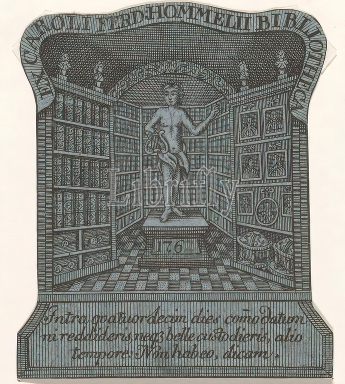 Ex libris, Karl Ferdinand Hommel, Ex Caroli Ferd, Hommelii Bibliotheca, title, object, Ex-libris, German jurist Karl Ferdinand Hommel, front, bookcase, statue, Apollo, wall, right, portrait collection, shelf, two globes, three-line motto, Latin, print maker, anonymous, 1767, paper, etching, engraving, snipping, height 82 mm × width 69 mm