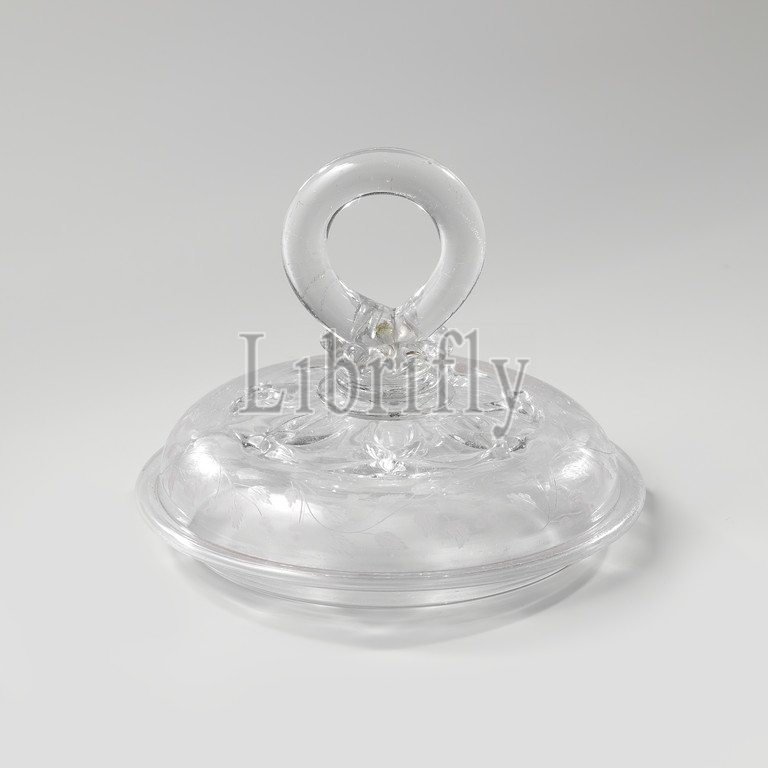 Lid, jar, ring-shaped knob, oak leaf, Vaulted lid, clear, colorless glass, blown-mold ornament blown, shape, Annular button, lid, continuous edge, branches, wheel engraving, c, 1680, 1700, glass, glassblowing