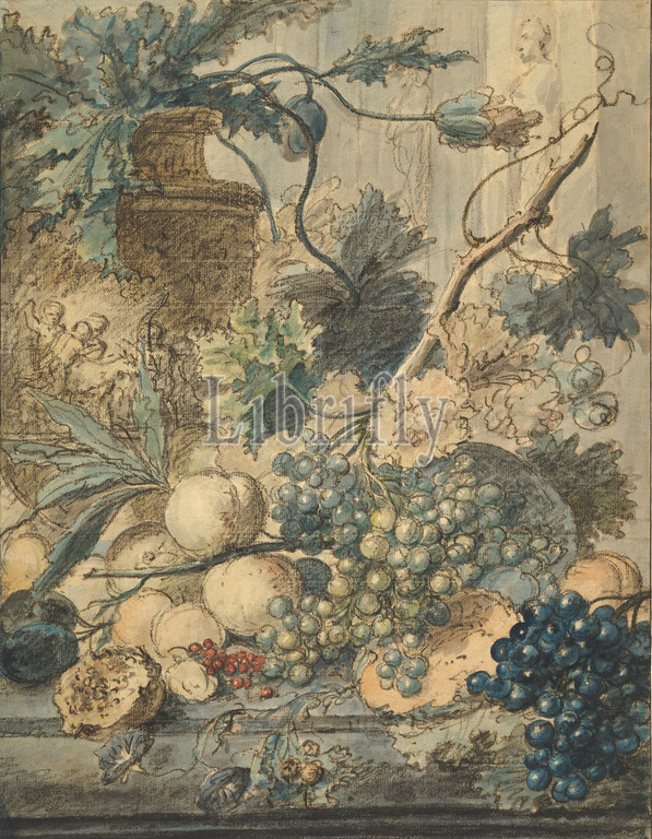 Life, Fruit, n.d, Black chalk, watercolor, cream white paper, Framing line, pen, black ink, 19 1/16 x 14 3/4, 48.4 37.5 cm, Drawings, Jan van Huysum, Dutch, Amsterdam, 1682–1749