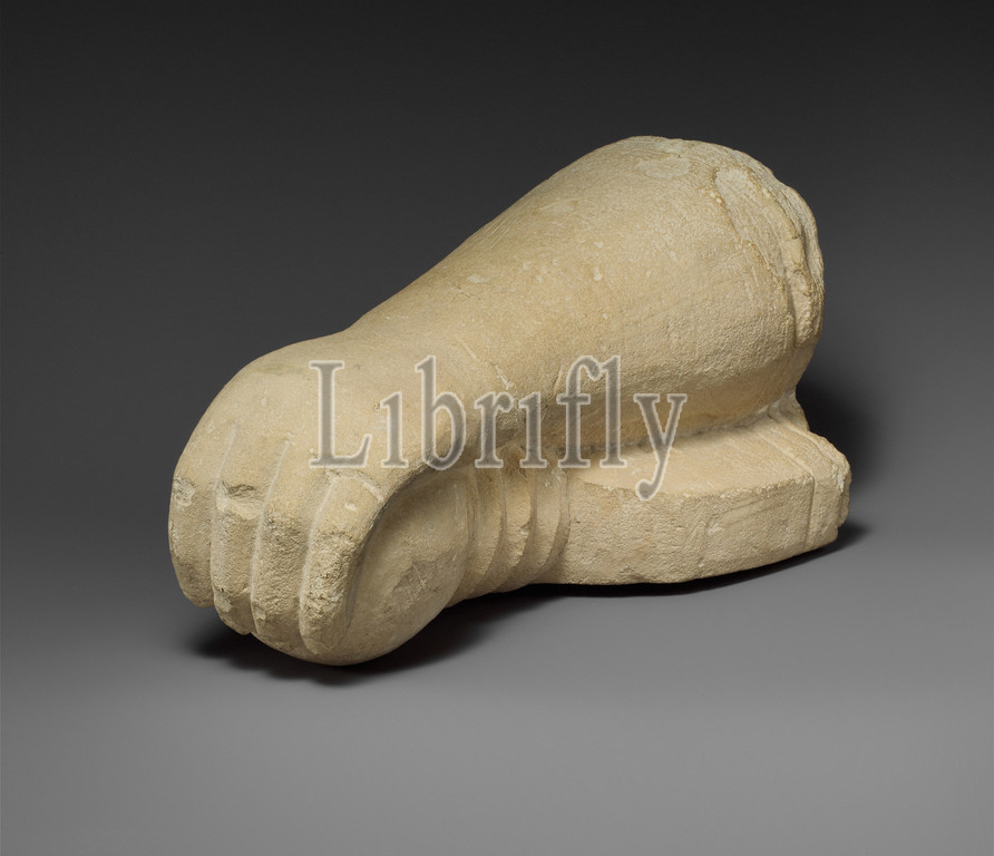 Limestone arm holding, sword, Hellenistic, Roman, 3rd century B.C.–1st .D, Cypriot, Limestone, Overall, 7 1/8 x 7 1/2 12 3/4, 18.1 19.1 cm, Stone Sculpture, left, forearm, hand, thumb, missing, belongs, large statue, hand holds, lower part, wide, flat object