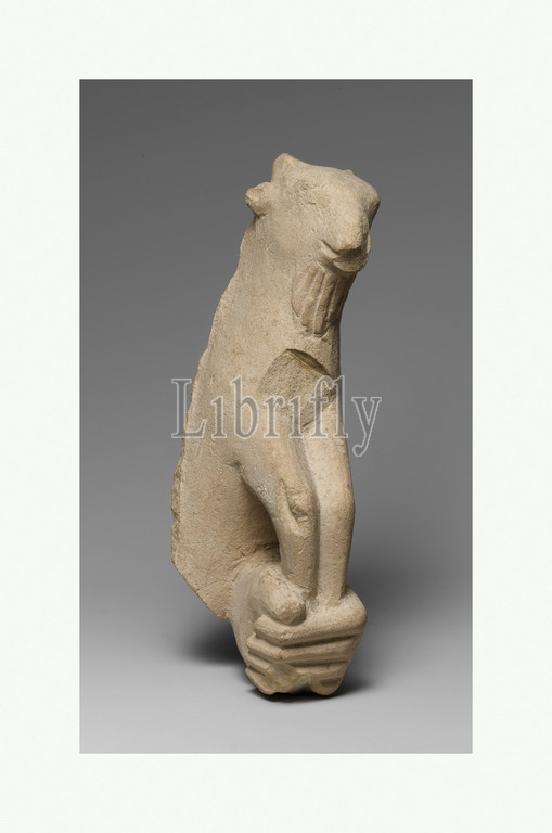 Limestone statue fragment, left hand holding, kid, Late Archaic–Early Classical, ca, 500–450 B.C, Cypriot, Limestone, Overall, 7 1/4 x 2 3/4 3 1/4, 18.4 7 8.3 cm, Stone Sculpture, lifesize, left, hand, holds, forelegs, goat, small horns, small, articulated beard