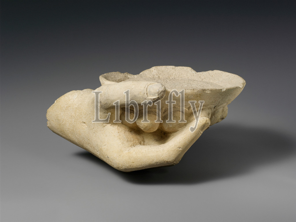 Limestone statue fragment, right hand holding, phiale, libation bowl, Late Archaic–Classical, late 6th–5th century B.C, Cypriot, Limestone, L, 9 5/8, 24.5 cm, D, phiale 6 1/2, 16.5, Stone Sculpture, large, right, hand, nails, well articulated, holds, fluted phiale, decorated, lotus flowers