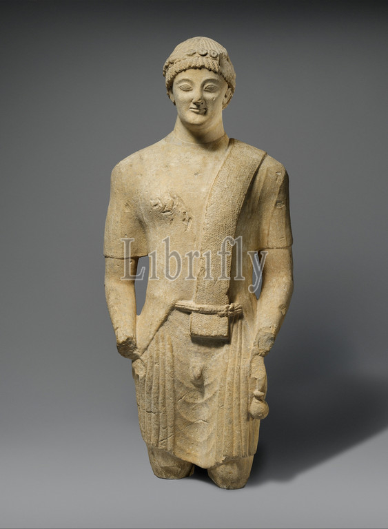Limestone statue, male votary, Cypro-Classical, first half, 5th century B.C, Cypriot, Limestone, 41 1/4 x 17 10, 104.8 43.2 25.4 cm, Stone Sculpture, figure, carries, aryballos, small oil, bottle, left hand, wears, sword sheath, right side, textured sash, worn, shoulder, unusual, headband decorated, rosettes, well-arranged clothing, complete, belt tied, Herakles knot, imply, represented, participant, procession, festival, fitting pose, votive