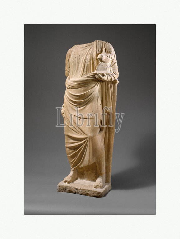 Limestone statue of a man holding a mask in the form of a bull's head, Classical, 2nd half of 4th century B.C., Cypriot, Limestone, H. 67 in. (170.2 cm), Stone Sculpture, From the Late Bronze Age onward bull's heads played a role in certain religious rituals on Cyprus. Actual skulls with openings at the back to be worn as masks, terracotta bull's heads, and figures wearing bull's heads as masks have been found on the island, suggesting that some deity was worshiped in this manner