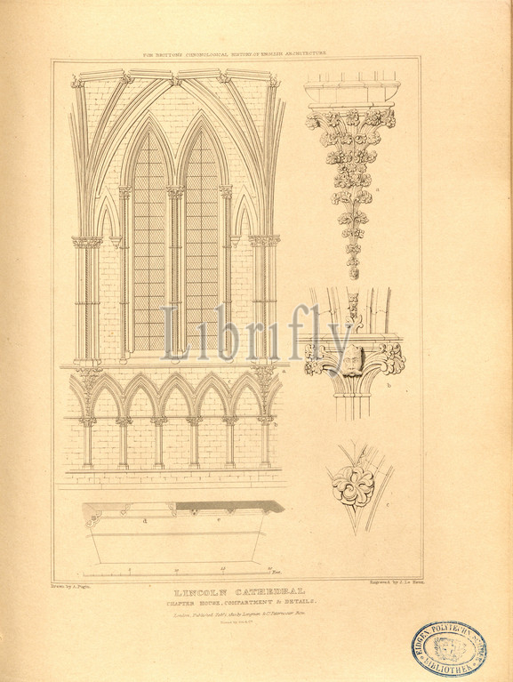 Lincoln Cathedral, chapter house, compartment, Lincoln Cathedral, Lincolnshire, signed: Drawn by A. Pugin; Etch'd by J. Le Keux; Published by Longman & Co, Fig. 54, p. 260, Pugin, Augustus Charles (drawing); Keux, John Le (etching); Longman & Co. (published), 1820, John Britton: The architectural antiquities of Great Britain: represented and illustrated in a series of views, elevations, plans, sections and details of various ancient English edifices: with historical and descriptive accounts of each. Bd. 5. London: J. Taylor, 1807-1826