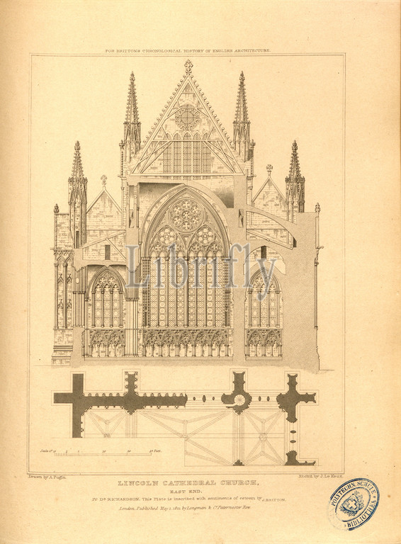 Lincoln Cathedral Church, east end, Lincoln Cathedral, Lincolnshire, signed: Drawn by A. Pugin; Etch'd by J. Le Keux; Published by Longman & Co, Fig. 58, after p. 260, Pugin, Augustus Charles (drawing); Keux, John Le (etching); Longman & Co. (published), 1821, John Britton: The architectural antiquities of Great Britain: represented and illustrated in a series of views, elevations, plans, sections and details of various ancient English edifices: with historical and descriptive accounts of each. Bd. 5. London: J. Taylor, 1807-1826