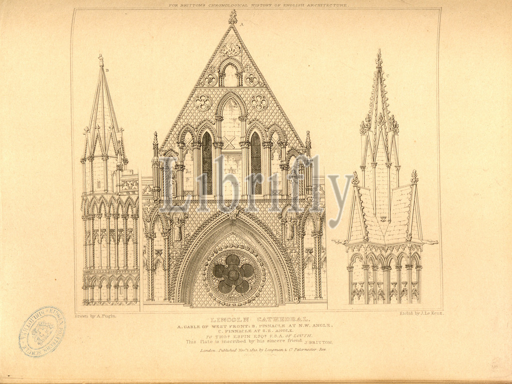Lincoln Cathedral: A. gable of west front, B. Pinnacle at n. w. angle, C. Pinnacle at s. e. angle, Lincoln Cathedral, Lincolnshire, signed: Drawn by A. Pugin; Etch'd by J. Le Keux; Published by Longman & Co, Fig. 52, p. 260, Pugin, Augustus Charles (drawing); Keux, John Le (etching); Longman & Co. (published), 1820, John Britton: The architectural antiquities of Great Britain: represented and illustrated in a series of views, elevations, plans, sections and details of various ancient English edifices: with historical and descriptive accounts of each. Bd. 5. London: J. Taylor, 1807-1826