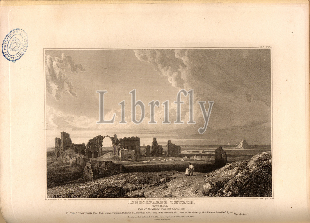 Lindisfarne Church, Durham, View of the Ruins, with the Castle, Church of the Lindisfarne Monastery in Northumberland, signed: W. Westall del, John Pye, Published by Longman & Co, Fig. 25, Pl. IV, after p. 82, Westall, William (drawing); Pye, John (engraving); Longmans & Co. (published), 1814, John Britton: The architectural antiquities of Great Britain: represented and illustrated in a series of views, elevations, plans, sections and details of various ancient English edifices: with historical and descriptive accounts of each. Bd. 4. London: J. Taylor, 1807-1826