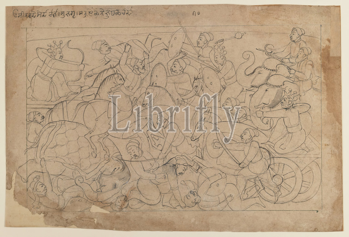 Line Drawing, Battle Scene, Bhagavata Purana Series, Indian, Attributed, Manaku, Indian, active c. 1725-1760, Ink, paper, Punjab Hills, India, ca. 1740-45, sheet, 8 5/8 x 12 3/4, 21.9 x 32.4 cm