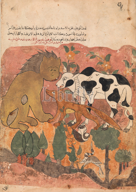 Lion King Receives, Ox, Shanzabeh, Escorted, Dimna, Folio, Kalila wa Dimna, 18th century, Attributed, Egypt, Syria, Ink, opaque watercolor, paper, 12.5, high 8.87, wide, 31.8 cm high 22.6 wide, Codices