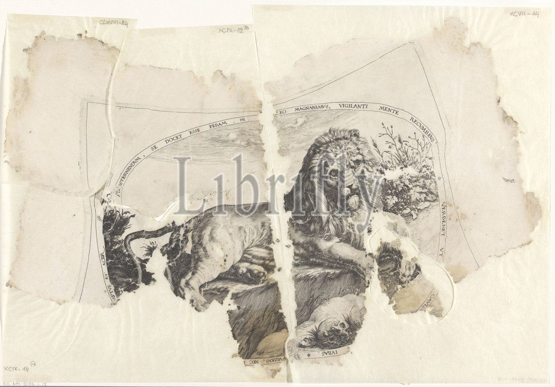 Lion, Oval representation, lion lying, skull, Latin border lettering, Reconstructed, five fragments, beasts, prey, predatory animals, lion, Jacob de Gheyn, II, Northern Netherlands, 1580, c, 1596, paper, engraving