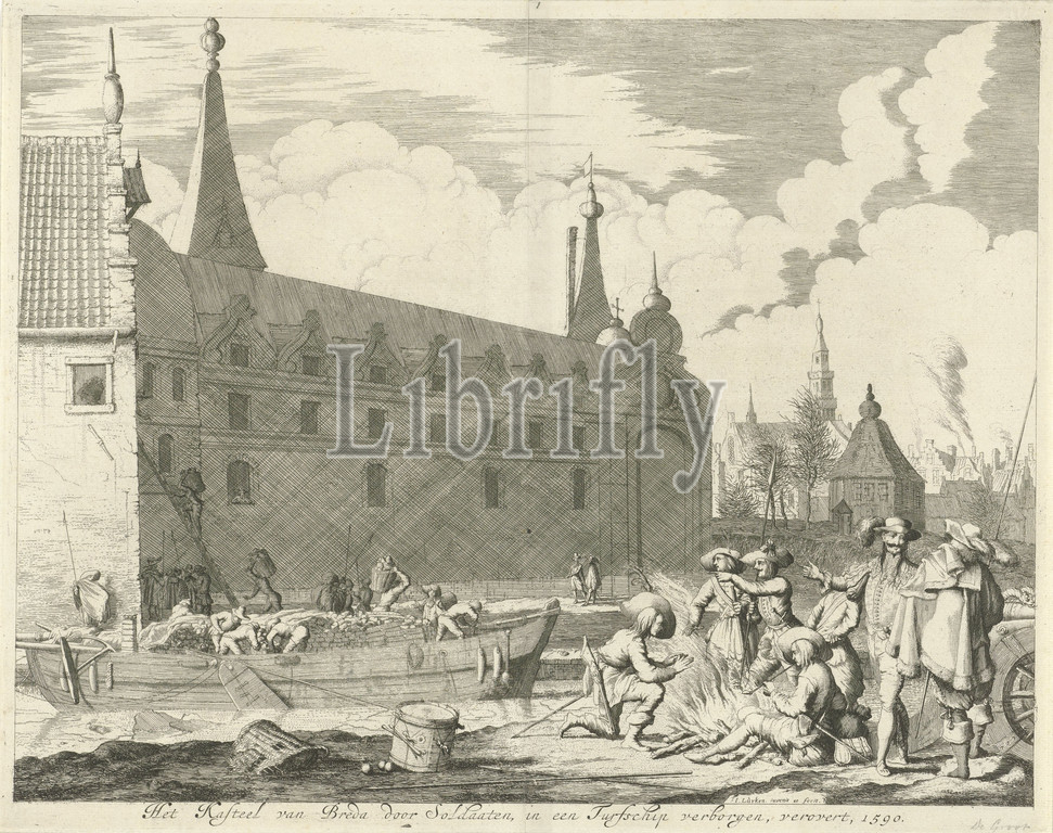 list, Peat ship, Breda, 1590, Castle, Soldiers, hidden, conquers, title, object, Capture, peat ship, 4 March 1590, Heraugières sends, men, castle, ship, foreground Spanish soldiers, campfire, traffic, transport, unloading, Charles de Heraugières, Jan Luyken, mentioned, Amsterdam, 1681, paper, engraving