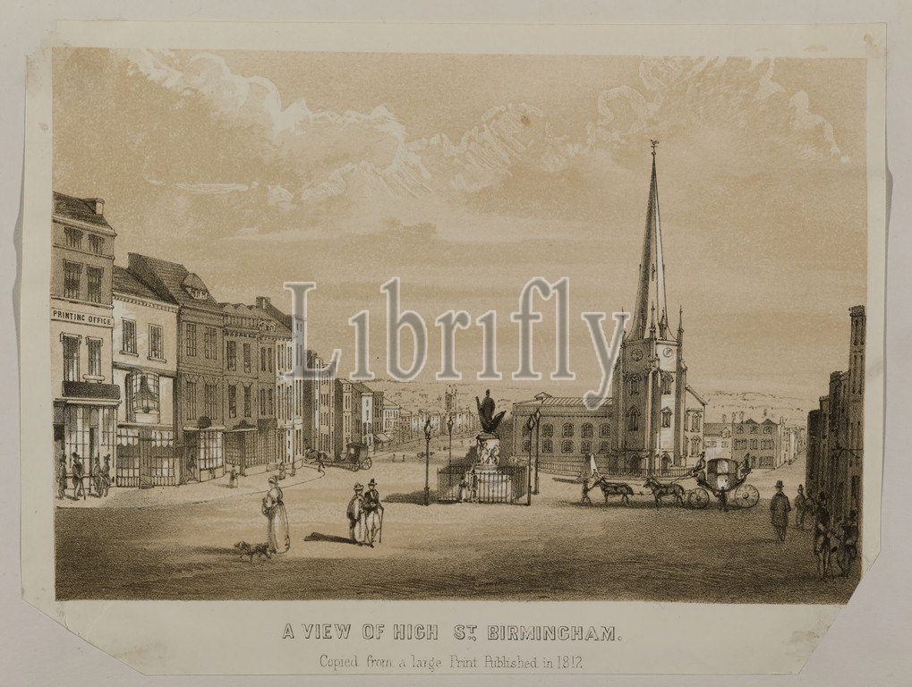 Lithograph, View, High Street, Birmingham Topographical Views, Vol II, View, High St, Birmingham, St Martin, Church, statue, Nelson, Copied, large print published, 1812, Topographical Views, Printing, Engraving, Printing, Lithography, Marketplace, Architecture, Church