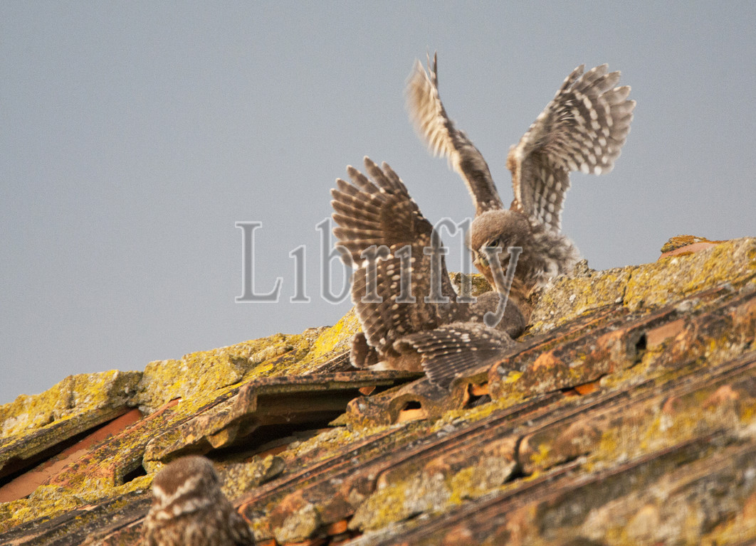 Little Owl immatures fighting, Athene noctua