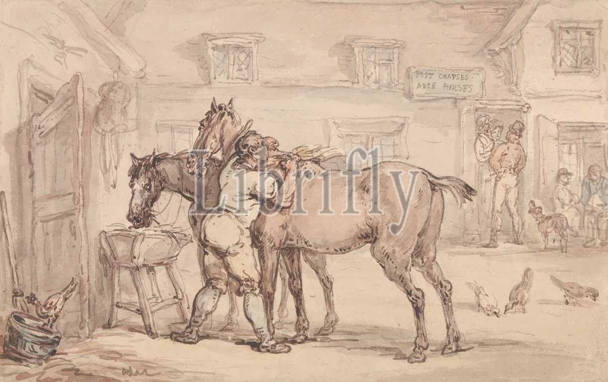 A Livery Stable, Thomas Rowlandson, 1756–1827, British, undated, Watercolor and graphite with pen and red-brown ink, pen and gray ink, and pen and brown ink on medium, slightly textured, beige, wove paper with pen in gray ink line and gray wash borders, Mount: 8 15/16 x 12 3/8 inches (22.7 x 31.4 cm) and Sheet: 5 7/16 x 8 11/16 inches (13.8 x 22.1 cm), bucket (vessel), buildings, chickens, dog (animal), doorways, genre subject, horses (animals), men, stable (carriage house), windows