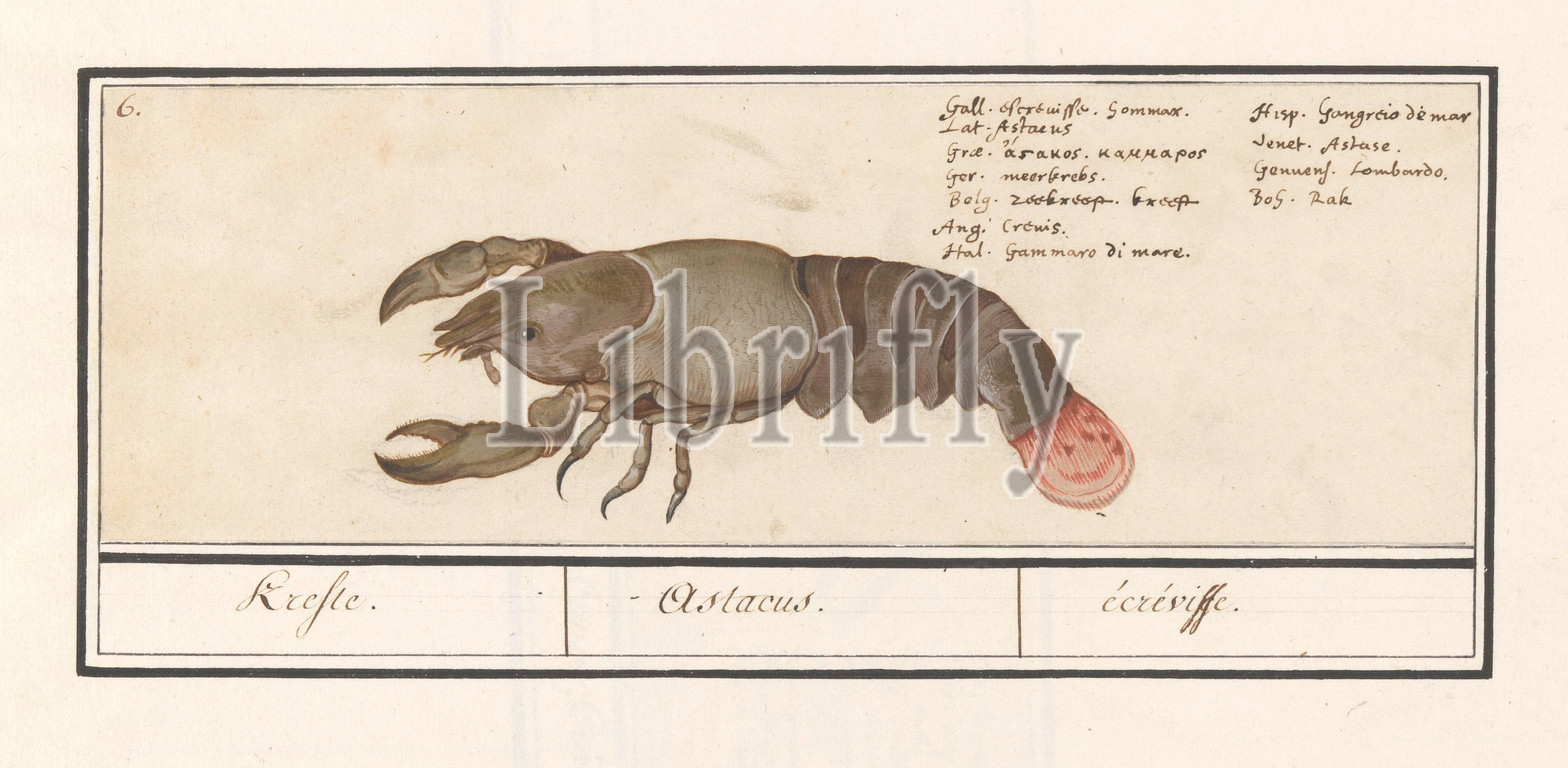 Lobster, Homarus gammarus, Astacus, écréviffe, title, object, European lobster, Numbered top left, 6, Top right, name, eleven languages, Part, sixth album, drawings, fish, shells, insects, Sixth, twelve albums, animals, birds, plants, 1600, commissioned, Emperor Rudolf II, explanations, Dutch, Latin, French, crustaceans, lobster, Anselmus Boetius de Boodt, 1596, 1610, paper, pencil, chalk, watercolor, paint, deck paint, ink, pen