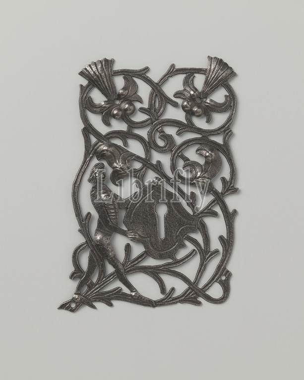 Lock plate, Openwork lock plate, tinned iron, Basically rectangular, decorated, interwoven leaf, tendril motifs, Bottom left, man, sort, coat, arms, front, keyhole, arranged, Fruits, fluted leaf, two upper corners, 1500, 1525, iron, metal, tin, engraving, l 15 0