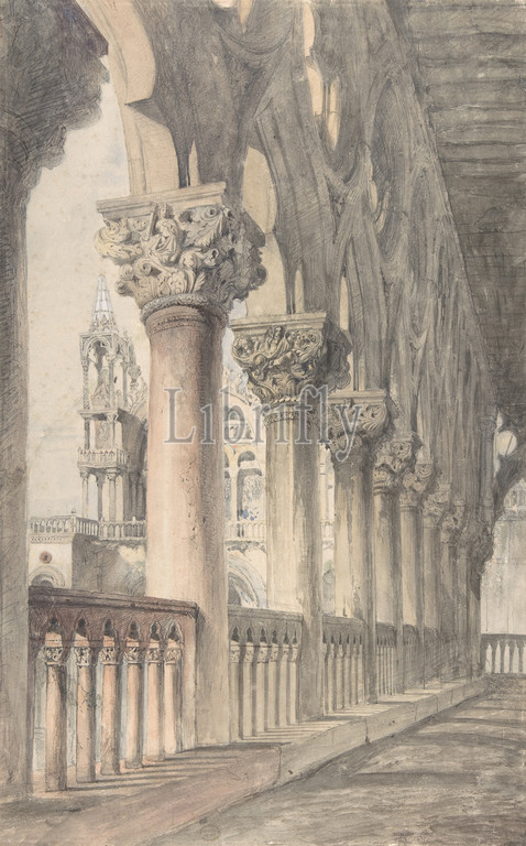 Loggia, Ducal Palace, Venice, 1849–50, Watercolor, graphite, Sheet, 18 1/8, 11 7/16, 46, 29 cm, Drawings, John Ruskin, British, London, 1819–1900, Brantwood, Cumbria, Ruskin painstakingly, depicted, shafts, capitals, ogival lacework, famous Gothic, loggia, red tinge, first two, different colored, marble, mark, place, sentences, death, proclaimed