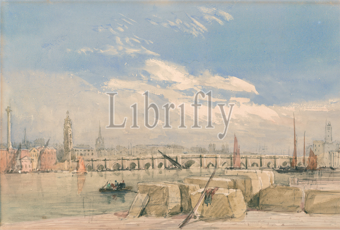 London Bridge, David Cox, 1783–1859, British, 1831, Watercolor, gouache, graphite, thick, smooth, cream wove paper, Sheet, Sheet, bridge, built work, cityscape, monument, river, London, Thames, United Kingdom