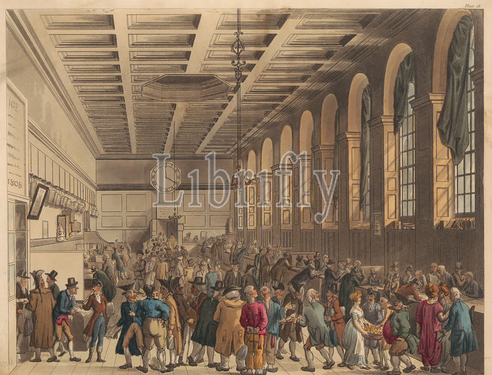 The Long Room, Custom House, Print made by Thomas Rowlandson, 1756–1827, British, and Augustus Charles Pugin, 1762–1832, French, 1808, Etching and aquatint with hand coloring in watercolor on medium, slightly textured, cream wove paper