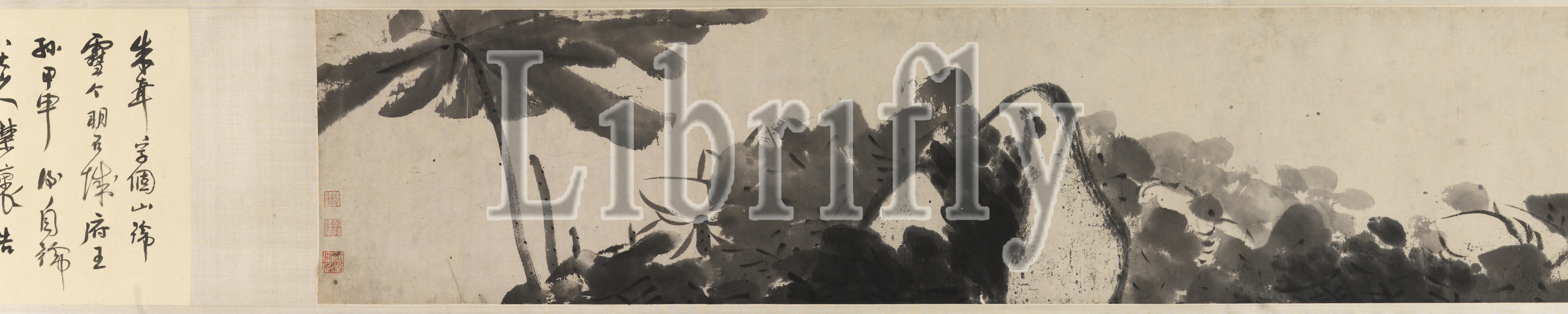 Lotus Pond, Zhu Da (Chinese, 1624-1705), Qing dynasty, period, Kangxi, 1689, ink on paper, 9-1/8 x 330-3/4 in., Signed: Bada shanren, Seal: kexiang ruchi, Seal: kede shenxian, Colophon: Wu Zheng (1876-1989) dated 1940, Collector's seals: Li Peijing (1826-1883), Zhou Xiangyun (1878-1943), Jiang Zuyi (1902-1973), Asian Art