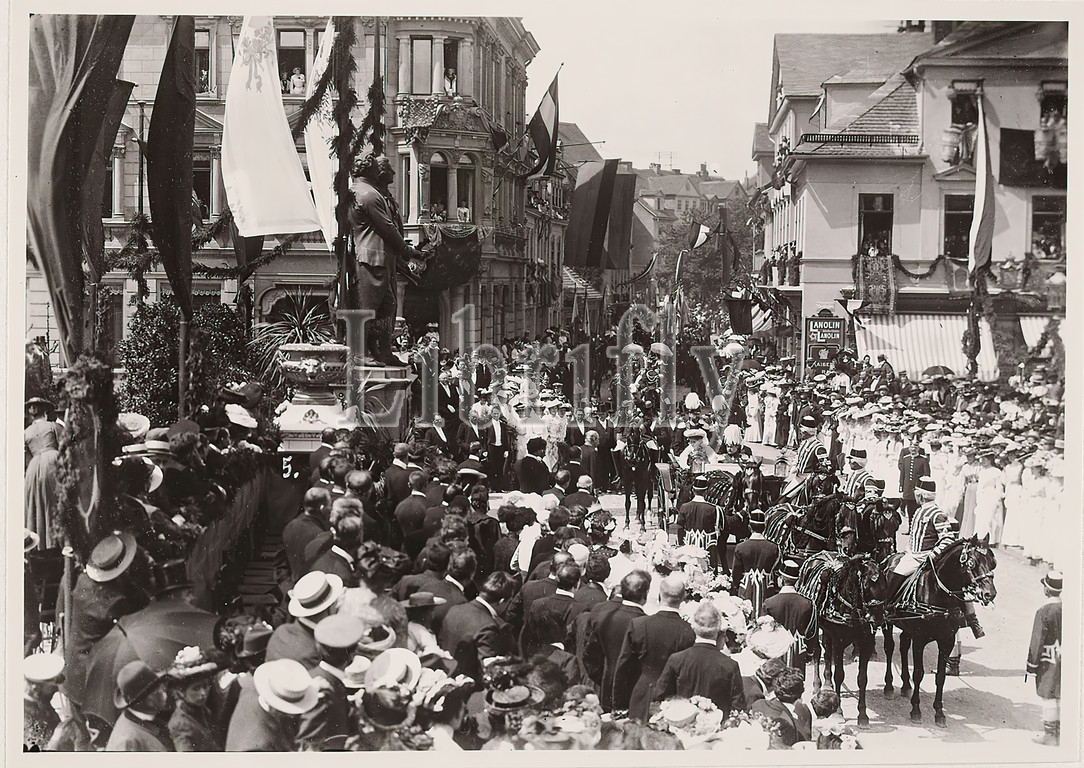 Louis Held, Unveiling of the State Monument to Grand Duke Carl Alexander of Saxony-Weimar-Eisenach, 1907, on the former Carlsplatz in Weimar, State Picture Gallery Hamburg, Collection on the History of Photography, silver gelatin paper, cardboard, black and white positive process, image size: height: 11.90 cm; width: 16.90 cm, inscribed: verso and on the cardboard: photographer, place, designation (inauguration of the Schiller-Goethe monument in Weimar ?), dimensions and inv.- No. handwritten in black, stamp: verso and left on the cardboard: stamp Staatliche Landesbildstelle Hamburg, reporting photography, monument, statue