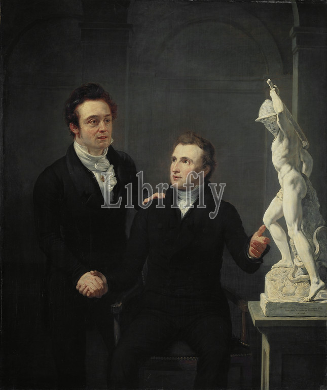 Louis Royer, Sculptor, Albertus Bernardus Roothaan, Stockbroker, Friend, Arts, Patron, Sciences, Portraits, 1787-1868, sculptor, 1793-1847, securities broker, art friend, promoter, sciences, two men shake hands, right, table, statue, Royer, Greek shepherd, beats, snake, Jan Willem Pieneman, 1825, canvas, oil paint, paint