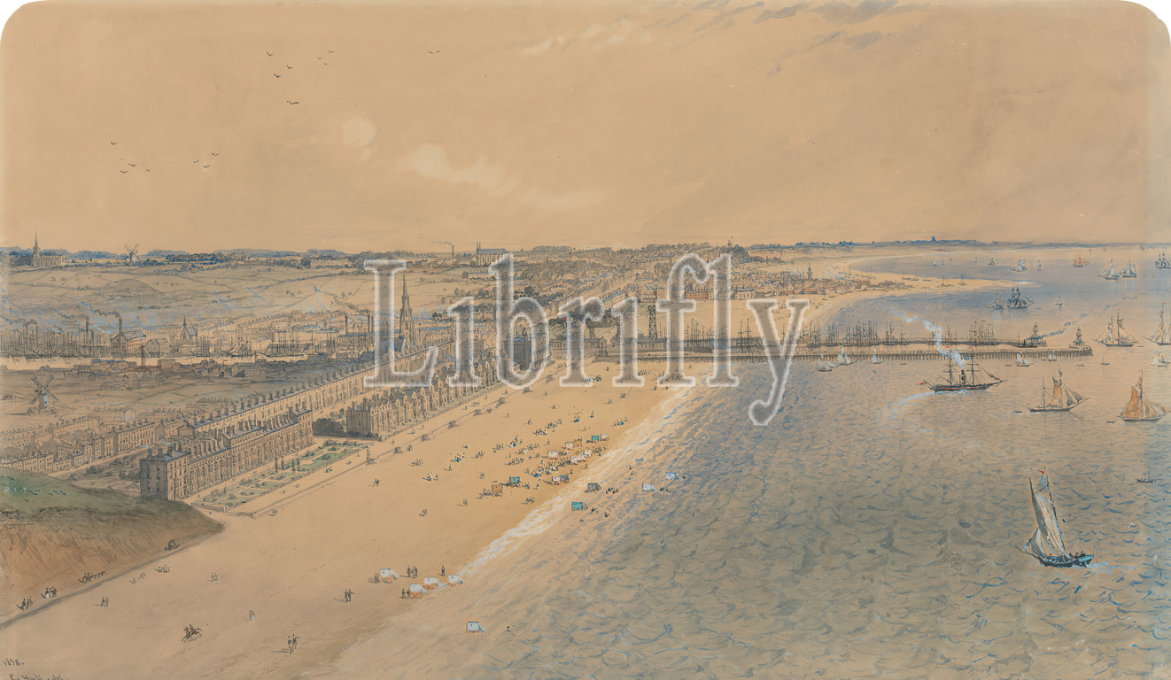 Lowestoft, Edward Hull, 1810–1877, 1858, watercolor, pen and black ink, gray ink, red ink, graphite, and gouache on thick, moderately textured, beige, wove paper, Sheet: 12 1/16 x 21 11/16in. (30.6 x 55.1cm)