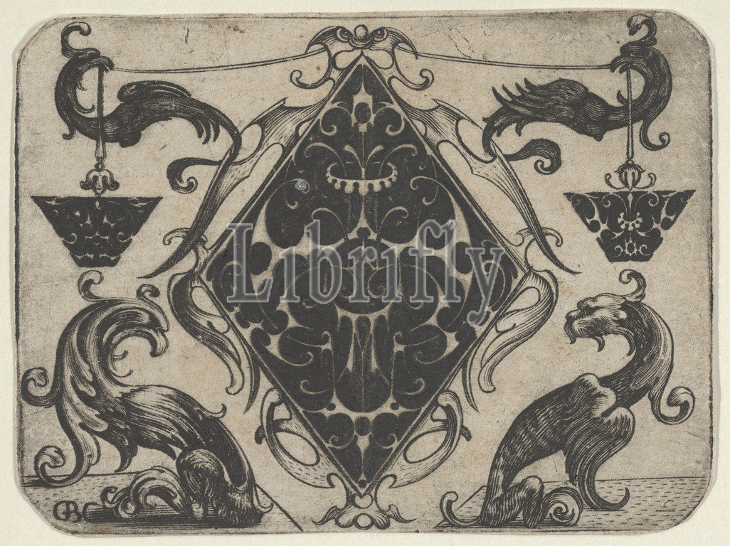 Lozenge-shaped Pendant and Two Trapezoid Motifs, 1622, Blackwork and Engraving, Plate: 2 11/16 x 3 9/16 in. (6.8 x 9.1 cm), Print from a series of six with goldsmith's designs in blackwork. This print shows designs for three elements of goldsmith's work with four fantastical creatures. In the center a lozenge-shaped pendant is presented