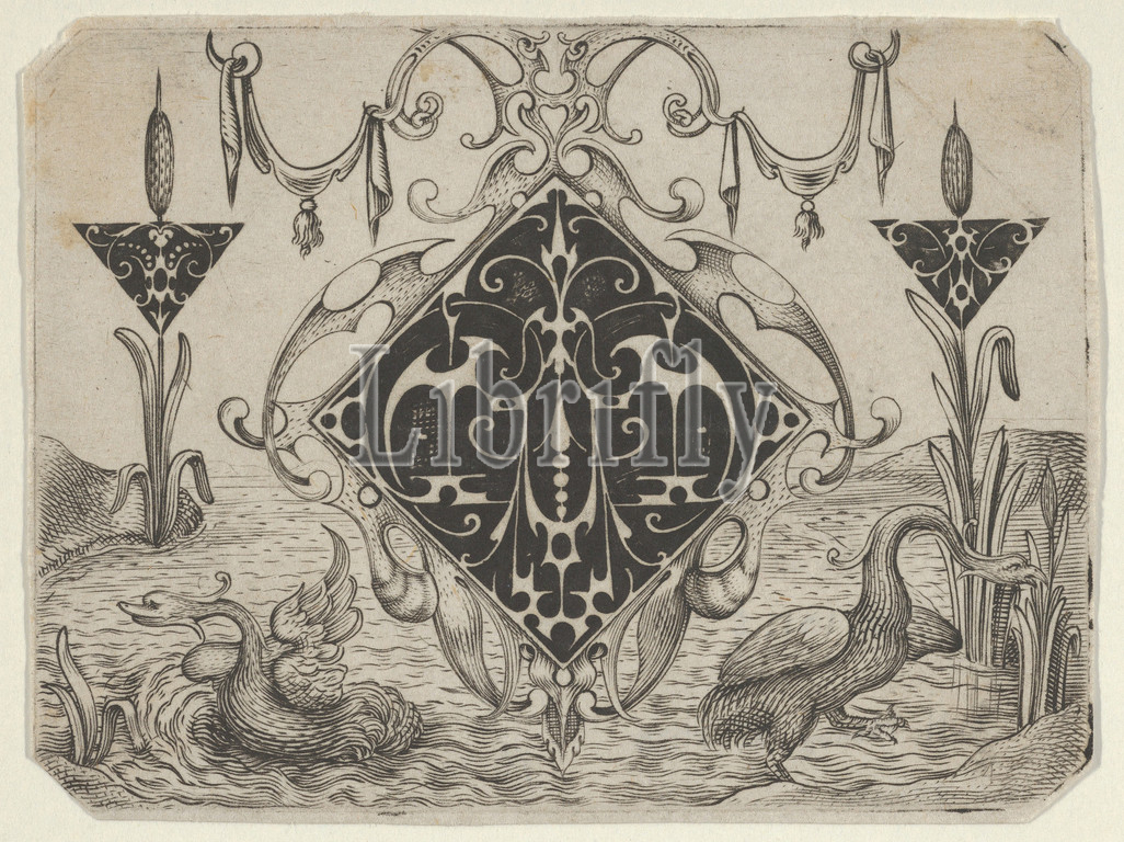 Lozenge-shaped Pendant, Two Triangular Motifs, Riverscape, 1622, Blackwork, Engraving, Plate, 2 5/8 x 3 9/16, 6.7 9 cm, Print, series, six, goldsmith, designs, blackwork, print, design, three elements, work, placed, riverscape, two waterbirds, center, lozenge-shaped pendant, presented, surrounded, organically-shaped openwork