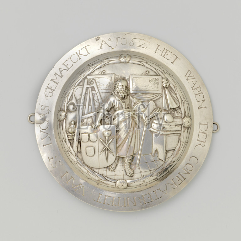 St, Lucas guild, Round shield, black-and-white, St. Lucas guild, Driven, painter, workshop, right hand, supported, coat, arms, Northern Netherlands, 1650, 1675, metal, engraving