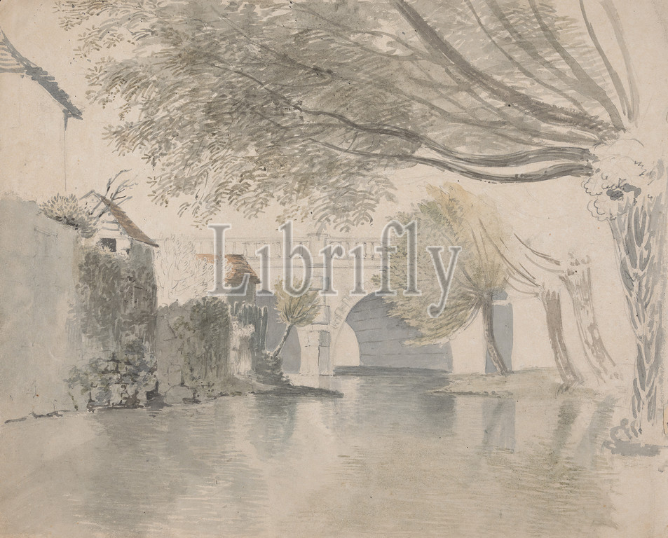Magdalen Bridge, Near Oxford, Rev. William Warren Porter, 1776–1804, British, undated, Watercolor and graphite on medium, slightly textured, cream wove paper, Sheet: 9 3/4 × 12 inches (24.8 × 30.5 cm), architectural subject, bridge (built work), dog (animal), genre subject, men, river, university, England, Europe, Magdalen Bridge, Oxford, Oxfordshire, United Kingdom