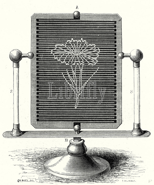 magic table, magic, table, invention, electricity, flower, science, 19th century engraving, vintage, old print, 19th century, victorian, retro, quint, lox, engraving