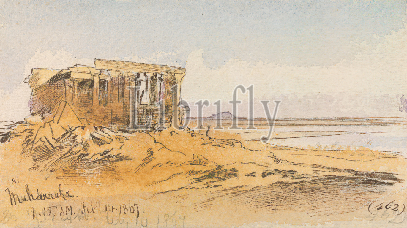Maharraka, 7, 15 am, 14 February 1867, 462, Edward Lear, 1812–1888, British, 1867, Watercolor, pen, brown ink, graphite, thick, rough, cream wove paper, Sheet, architectural subject, desert, lake, landscape, monument, ruins, sand, sky, temple, water, Africa, Egypt, Lake Nasser, Nubia