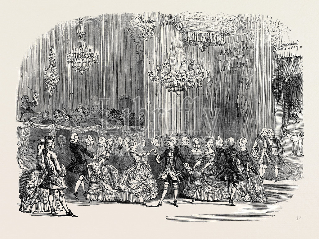 majesty's, costume, ball, sir, roger, coverley, dance, picture, museum, exhibition room, gallery, 1845 engraving, engraved image, history, illustrative technique, engravement, victorian, arts, culture, retro styled, vintage, retro, arkheia