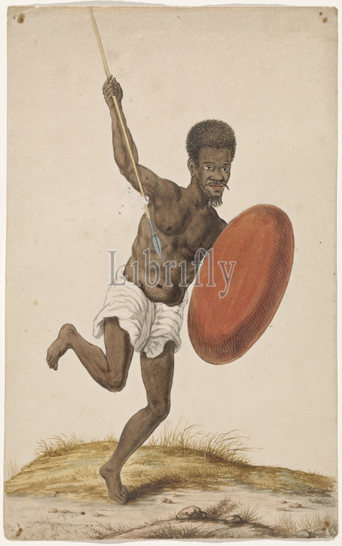 Malagasy warrior, assegai, shield, Black warrior, white cloth, wearing, assegaai, spear, red shield, Africans, Madagascar, Netherlands, c, 1675, 1725, paper, watercolor, paint