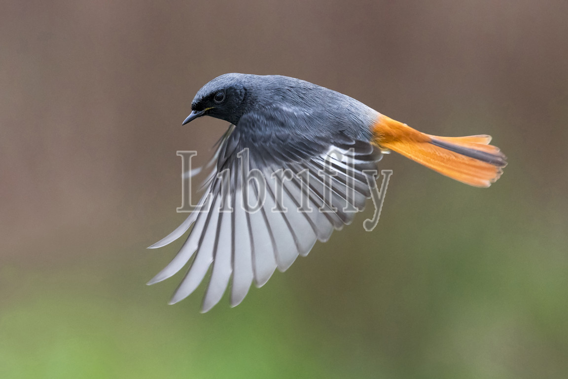 Male Black Redstart in flight, Phoenicurus ochruros, Italy