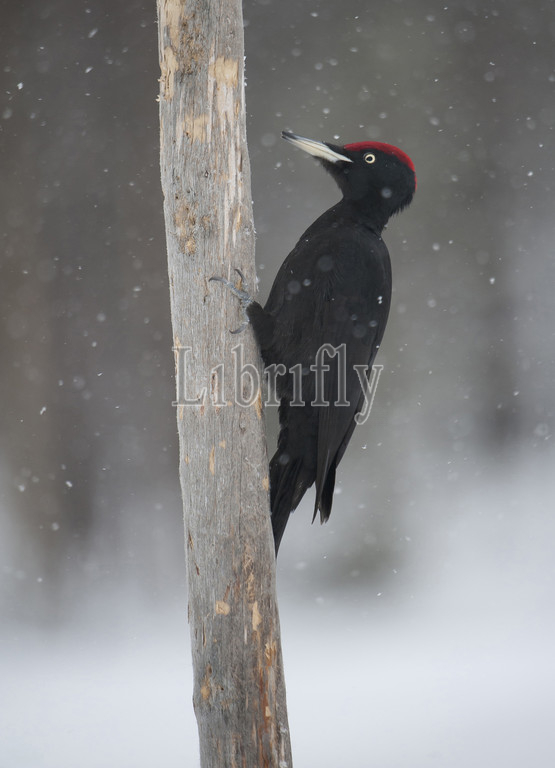 Male Black Woodpecker in winter, Dryocopus martius, Sweden