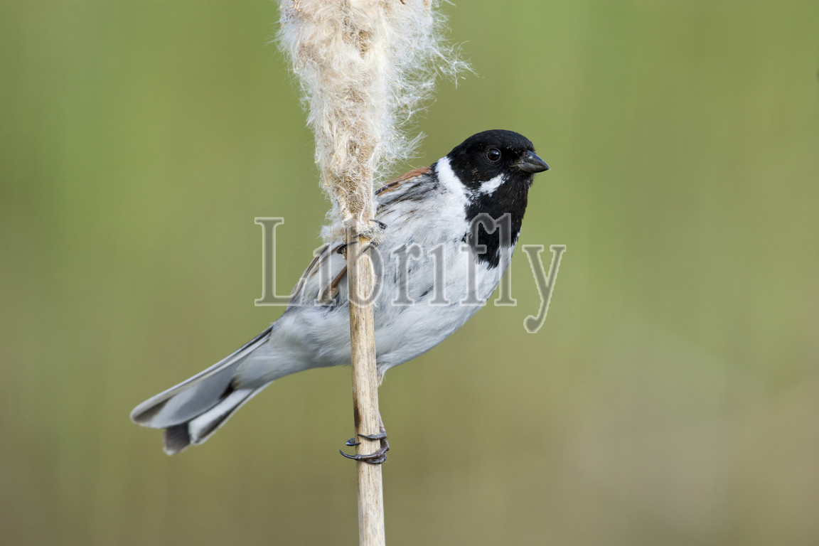 Male Common Reed Bunting on cattail stalk Netherlands, Emberiza schoeniclus, Netherlands