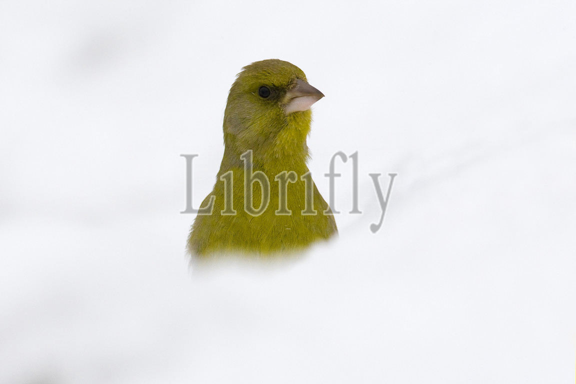 Male European Greenfinch in snow, Chloris chloris, Italy