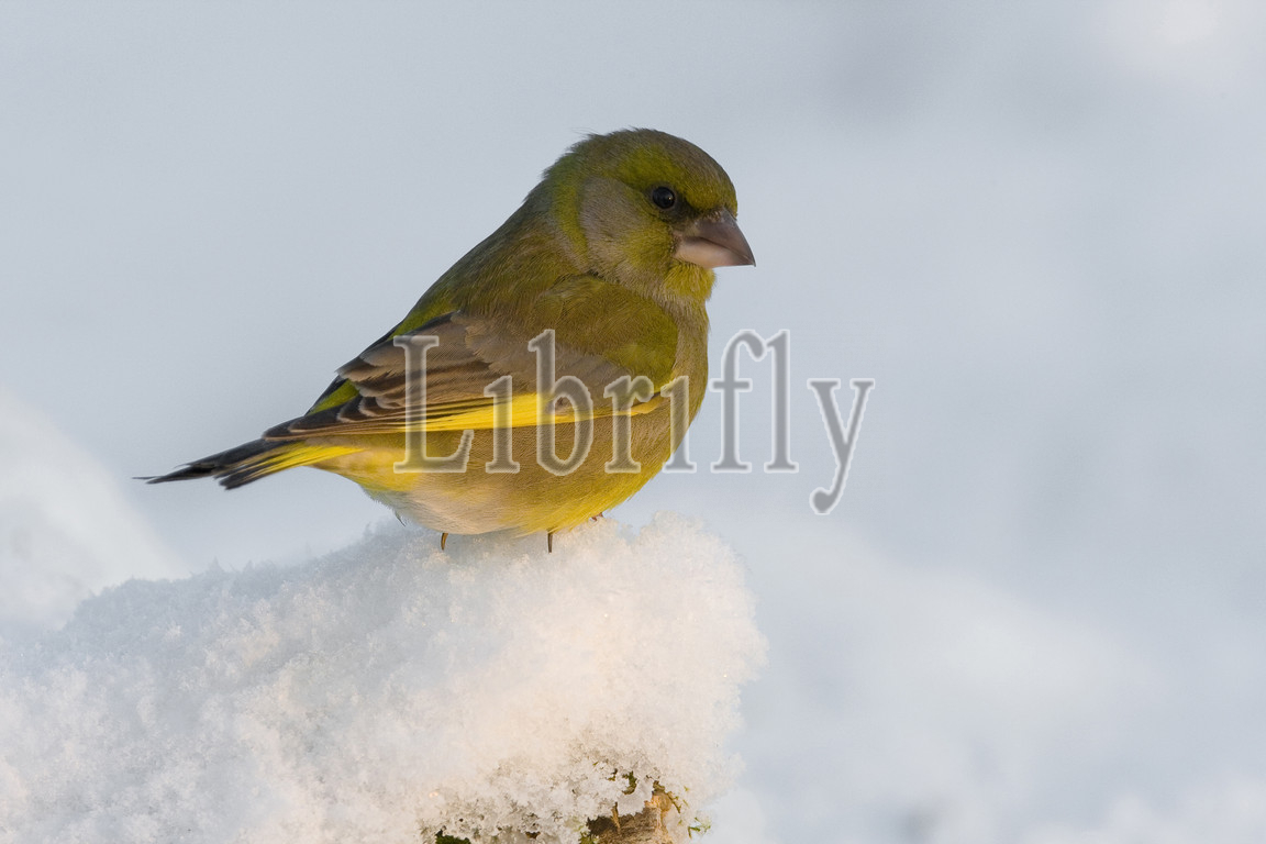 Male, European Greenfinch, snow, Chloris chloris, Italy, nature, bird, animal, wildlife, wild, fauna, natural, feather, sky, beak, wing, outdoor, freedom, colourful, Liszt, Natural History, ornithology, vertebrate animals, photography, color image