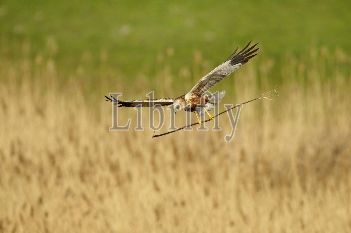 Male Marsh Harrier with nestmaterial in flight, The Netherlands