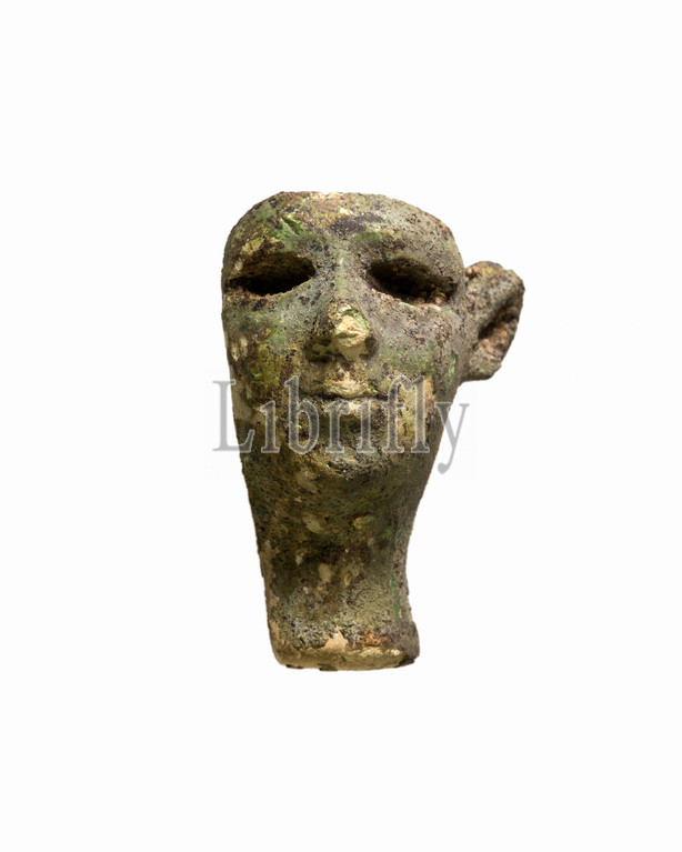 Male, originally red, head, composite statuette, Late Period–Ptolemaic Period, 664–30 B.C, Egypt, Glass, H, 4.3, W, 2.8, T, 2.8 cm, 1 11/16, 1/8, glass, formed, part, statue, might, fit, wooden, metal.body, crown fitted, brow, Originally, red glass, degrades, green