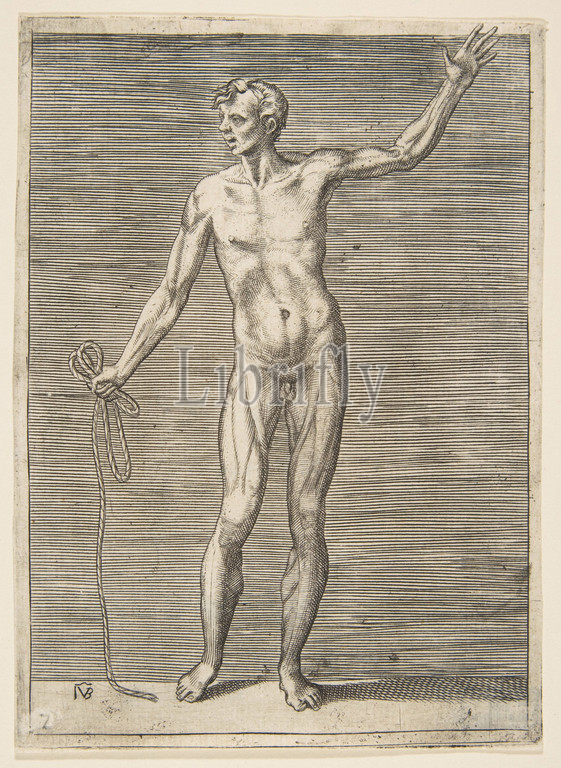 Man, Front, holding, Rope, right Hand, 16th century, Engraving, sheet, 6 1/8 x 4 7/16, 15.5 11.3 cm, Prints, Giulio Bonasone, Italian, active Rome and Bologna, 1531–after, 1576