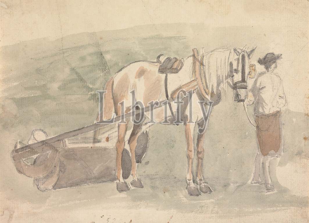 Man With a Horse Harnessed to a Roller, Sawrey Gilpin, 1733–1807, British, undated, Watercolor and graphite on medium, moderately textured, beige, laid paper, Sheet: 6 3/16 × 8 9/16 inches (15.7 × 21.7 cm), genre subject, harness, horse (animal), man, roller