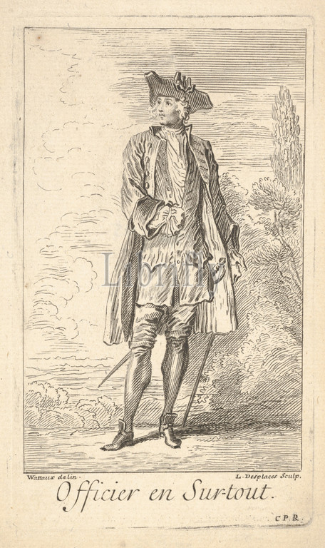 Man, officer, dress, sword hanging, left hip, shown, frontal view, head turned, left, trees beyond, ca, 1700–1739, Etching, engraving, sheet, 7 3/16 x 4 11/16, 18.3 11.9 cm, Prints, Louis Desplaces, French, Paris, 1682–1739, After Antoine Watteau, Valenciennes, 1684–1721, Nogent-sur-Marne