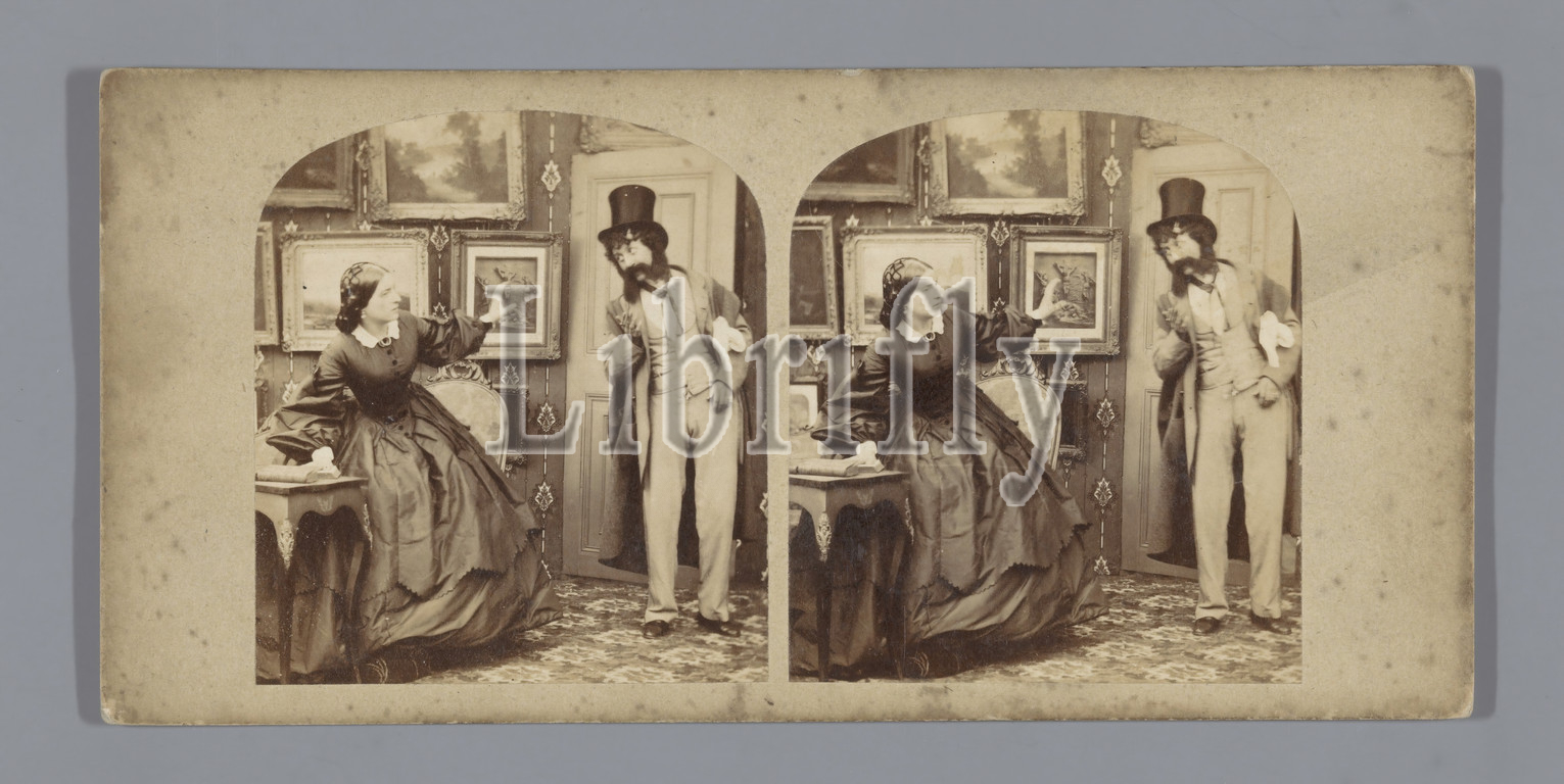 Man, top hat, woman, room, paintings, drawing room, salon, head gear, Europe, c, 1850, 1880, cardboard, photographic paper, albumen print